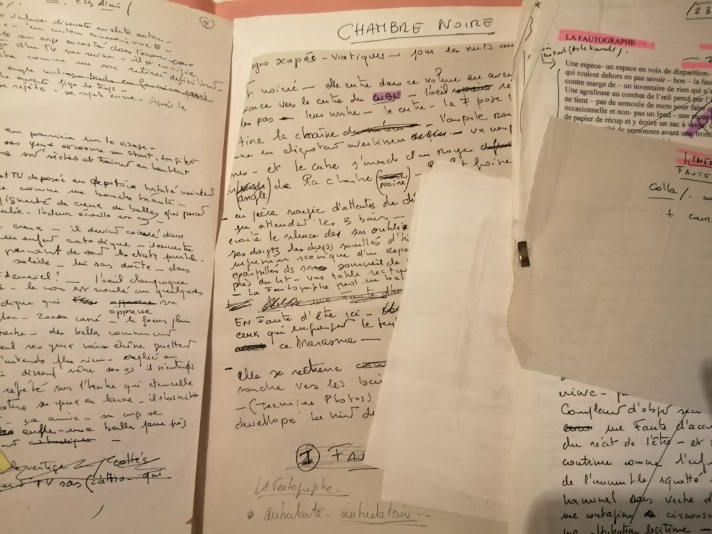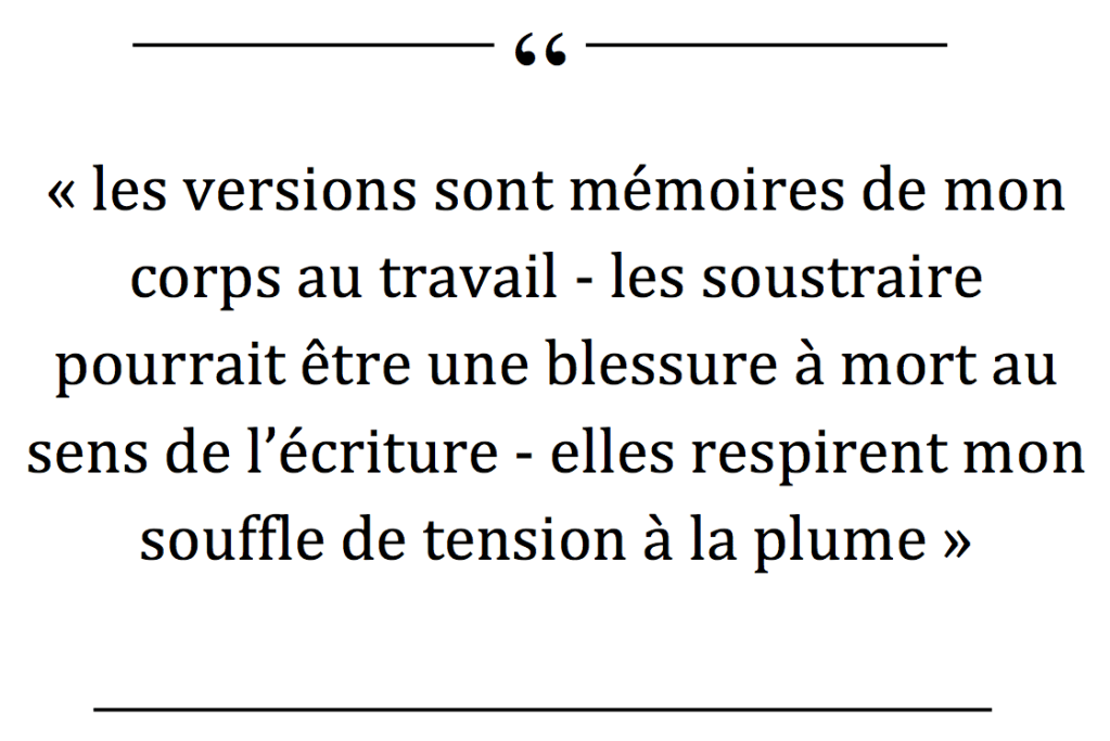 je ne définis pas le nombre de versions – ce sont elles qui me définissent – j’use en réparant en permanence pour que les temps blancs du squelette tiennent – je ne jette pas ces versions – elles restent près de moi le temps d’écriture du prochain livre – lorsqu’il est fini je prends les versions de La Fautographe les regardent une dernière fois et les placent dans une boîte en repos – je peux parfois y revenir mais cependant dans mes carnets j’ai déjà collé des mouvements non utilisés pour éventuellement les reprendre pour un prochain récit – les versions sont mémoires de mon corps au travail – les soustraire pourrait être une blessure à mort au sens de l’écriture – elles respirent mon souffle de tension à la plume – les rythmes plus ou moins dilatés de la narine ouverte ou obturée presque en apnée – l’archive ? – non – je ne suis pas intéressée par cela – mon écriture est incandescente – d’autres peut-être un jour s’en préoccuperont – je crois que cela part d’un « autre » – peu de l’auteur – je pense également que cela tient de ce que l’on veut laisser ou pas – pour ma part je suis née « presque morte » sans rien et je quitterais ce monde de la même façon –