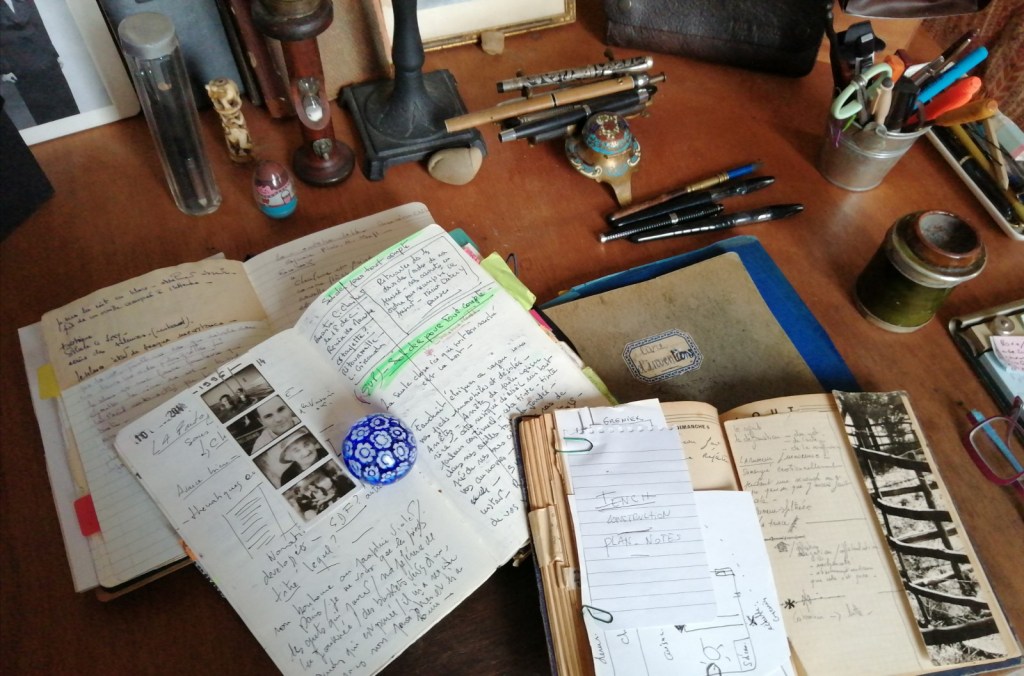 non pas tous les jours – je n’ai pas cette régularité – je suis à ma table tous les jours mais pour lire / prendre des notes / dessiner / choisir des photos regarder des œuvres qui m’apaisent m’intriguent et j’écoute la vie réelle / les mouvements de ma rue ou des terrasses autour de mon coin de ciel / vérifier mes stylos-plumes les nettoyer pour qu’ils soient prêts / écrire à des ami(e)s poètes – j’incube l’écriture des jours semaines avant le tempo l’urgence aussi – à l’encre / il y a des notes partout mots-clés sensations / je regarde et renifle autour / stockage de vidéos / sons et images / et peu à peu presque en accident un mouvement prend le dessus et s’impose –