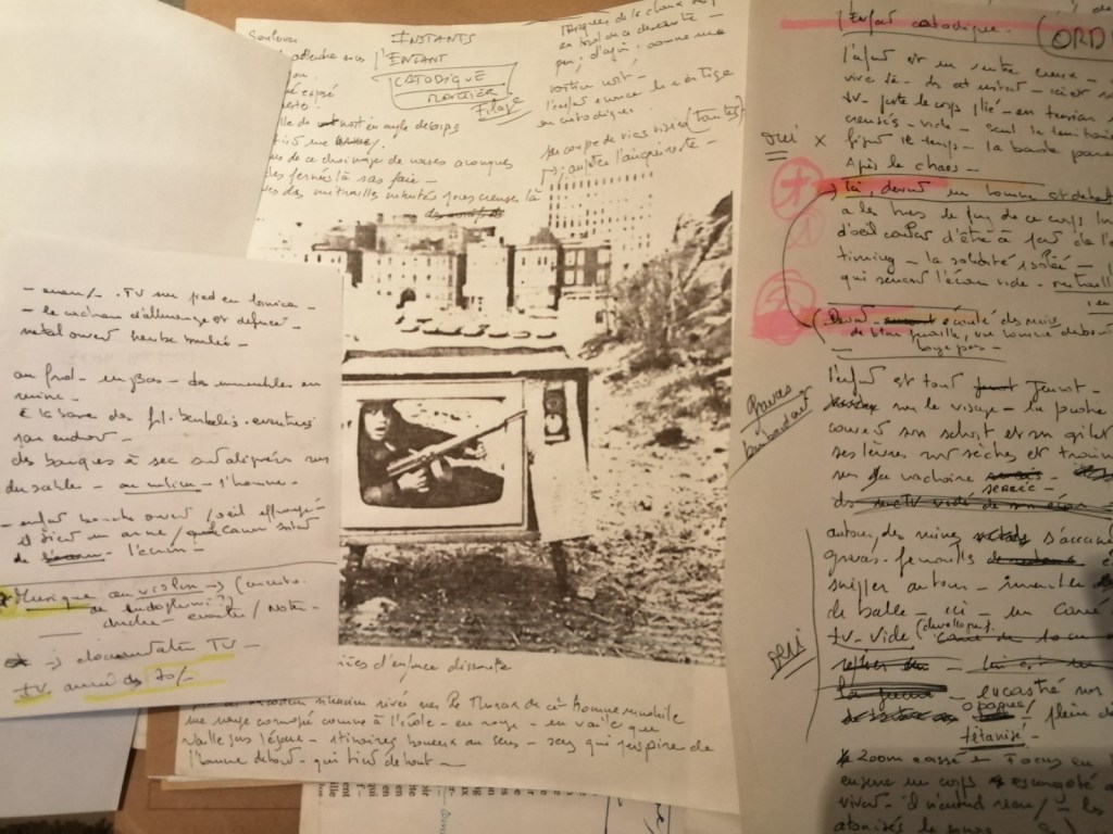Marasme s’est imposé de façon urgente et vitale – le début des délocalisations en masse des usines – inondations terribles et surtout l’arrivée des bandes passantes à la télé des chaînes d’infos résumant un drame en un slogan indigne / nous y sommes encore et même plus – je tenais en compte-fil à rendre des instants de vie sociale abandonnés – les blocs sédimentés dans le récit inscrivent les traces laissées – d’autres récits non publiés encore portent la même intention – celle de la tension mise en place dans la forme par le temps blanc – Mortier publié dans Triage chez Tarabuste est sur la même recherche – même agitation nécessaire pour porter l’œil – j’ai pour chaque récit une photo qui me suit sur la table d’écriture jusqu’à la fin – même si elle semble loin du propos elle concentre ma structure mon squelette pour y inscrire de la chair autour – le carnet ou les carnets sont présents pour ne pas perdre l’œil / ils structurent en mots-clés mes pensées essentielles les canevas qui construiront le travail – la vidéo aussi est présente pour le mouvement musical et l’instant de tension en lien au réel – récemment pour mon dernier récit j’ai aperçu une araignée qui tentait désespérément de monter sur son fil mais une goutte d’eau en bloquait le passage – je l’ai observée longtemps puis je l’ai prise en zoom vidéo – ceci pour garder ce temps de filage – pour essayer de mettre en motif la dernière partie de mon récit vers une converse avec Louise Bourgeois – j’ai à ce jour écrit cinq versions de ce motif sans encore de satisfaction – trop d’esthétique encore comme dirait un de mes amis poètes – ces matériaux me permettent de tenir le vide avant le moment d’écrire sur la feuille papier – il me faut là aussi de la matière /plusieurs stylos plumes – porte-plume et différents papiers (toujours trouvés dans des papeteries avec leur arrière-boutique pleine d’un papier d’hier – invendu) pour écrire selon la tension de ma main – avant de taper une fin –