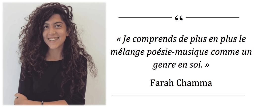 F. Chamma : Je comprends de plus en plus le mélange poésie-musique comme un genre en soi. Il ne s’agit pas de texte poétique accompagné de musique, mais d’une forme d’expression unique entre ces deux formes compatibles. C’est une forme que je découvre de plus en plus dans mon travail, surtout avec le duo, Chamæleon [2] dont je fais partie.