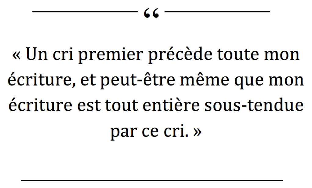 Oui il y a bien un cri premier qui précède toute mon écriture, et peut-être même que mon écriture est tout entière sous-tendue par ce cri. C’est évidemment le cri impossible du nourrisson que je fus qui, né étranglé, n’a pas pu expulser ce cri immédiatement. Le cordon a dû être dégagé de ma gorge avant la respiration, avant le cri. Cela a sans doute joué dans ma personnalité, dans mon rapport au monde, aux autres, à l’écriture qui souvent manque, et tente de dire ce manque, de souffle dans une même respiration (ou non-respiration). J’aime dire le manque d’air initial qui m’a permis de crier un peu plus tard mais plus fort. Cette distance est sans doute celle de la femme poète que je suis, animée du juste mot, du juste son. Comme dans ma famille la communication n’est pas toujours évidente, je me suis vite sentie étrangère, à part, et je me suis vite isolée pour écrire dans une pièce à moi où je ne me trouverais ni empêchée d’être moi-même ni empêchée de crier. J’ai souvent eu l’impression de devoir crier pour me faire entendre. J’étais une petite fille très colérique et puis, plus tard, j’écoutais de la musique punk qui me défoulait beaucoup. [Rires]