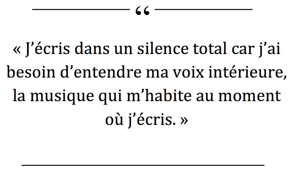 Au départ je ne pensais pas lire mes textes en public. Il s’agit d’abord d’écrire et en effet dans la solitude et je rajouterai même dans le silence en ce qui me concerne. J’écris dans un silence total car j’ai besoin d’entendre ma voix intérieure, la musique qui m’habite au moment où j’écris. On me dit souvent que mes textes sont assez chantants, possèdent une musicalité particulière faite de rythme, de répétition tournant parfois à la ritournelle et c’est sans doute vrai mais non sciemment recherché. Ce rythme propre à ma voix poétique lui est inhérent et vient naturellement à l’écriture. Ce qui ne veut pas dire que je ne retravaille pas mes textes après coup pour accentuer un rythme ou au contraire le couper.