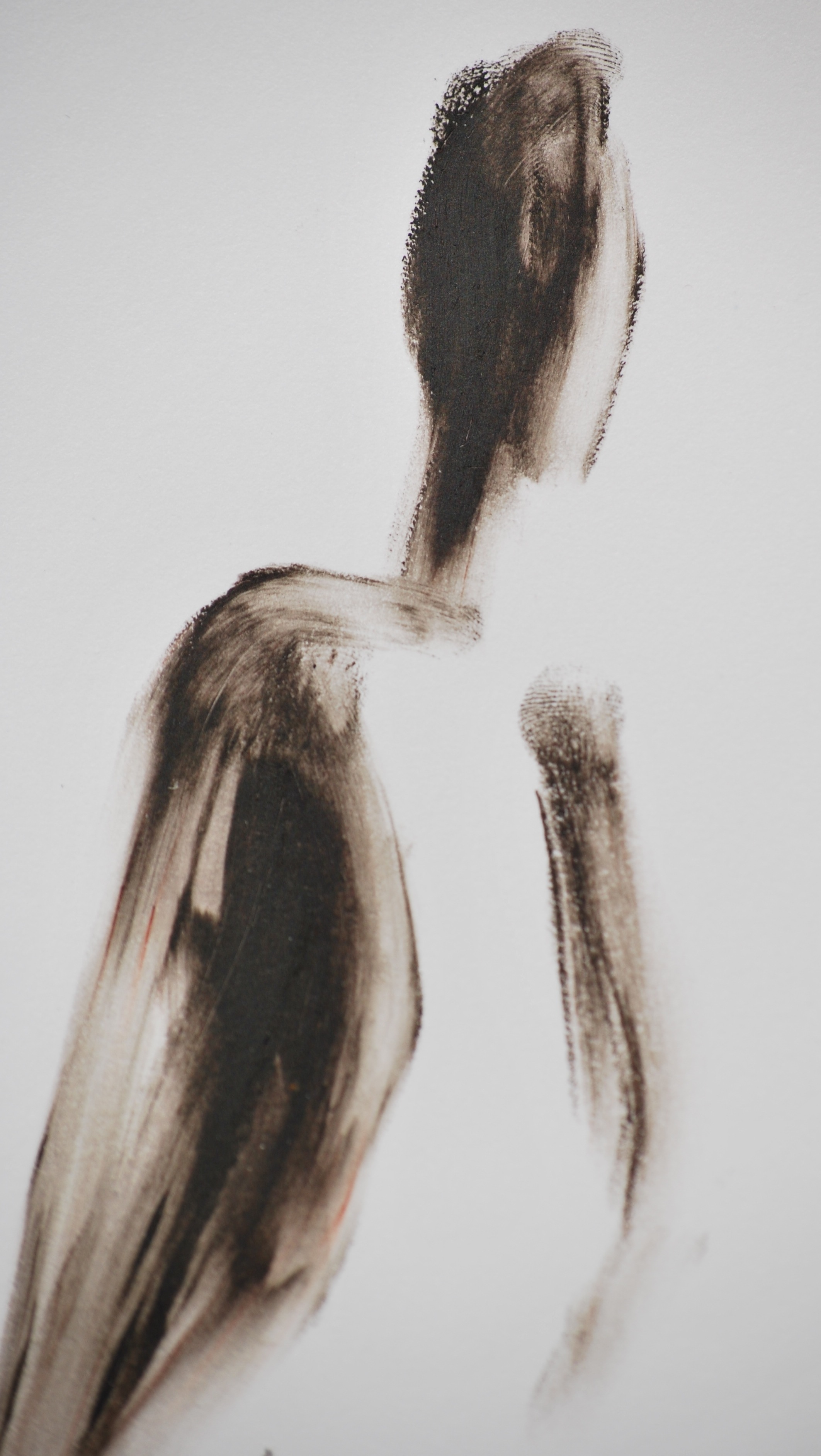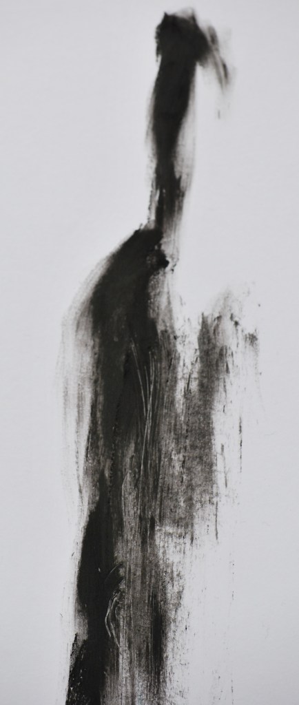 J’y ai trouvé par ce geste une nouvelle énergie que je ne dirais pas noire car elle était une réponse à la noirceur. Certes la craie grasse utilisée était noire ou très brune mais j’ai toujours aimé cette non-couleur qui permet de jouer avec la lumière. Et puis ces corps je les ai nommés « en rêve » non en cauchemars ! Et ce terme de « en rêve » avait pour moi plusieurs significations. Sans doute il me rendait le pouvoir de l’imaginaire, mais il m’offrait une nouvelle matière comme on dit « en or » ou en « pierre ». La matière du rêve que l’on cherche sans doute toujours. Rendue à ma solitude et ma déchirure, tous ces êtres fantomatiques, bancals, ou fièrement debout malgré tout m’ont repeuplée, réparée, rendue au monde des vivants.