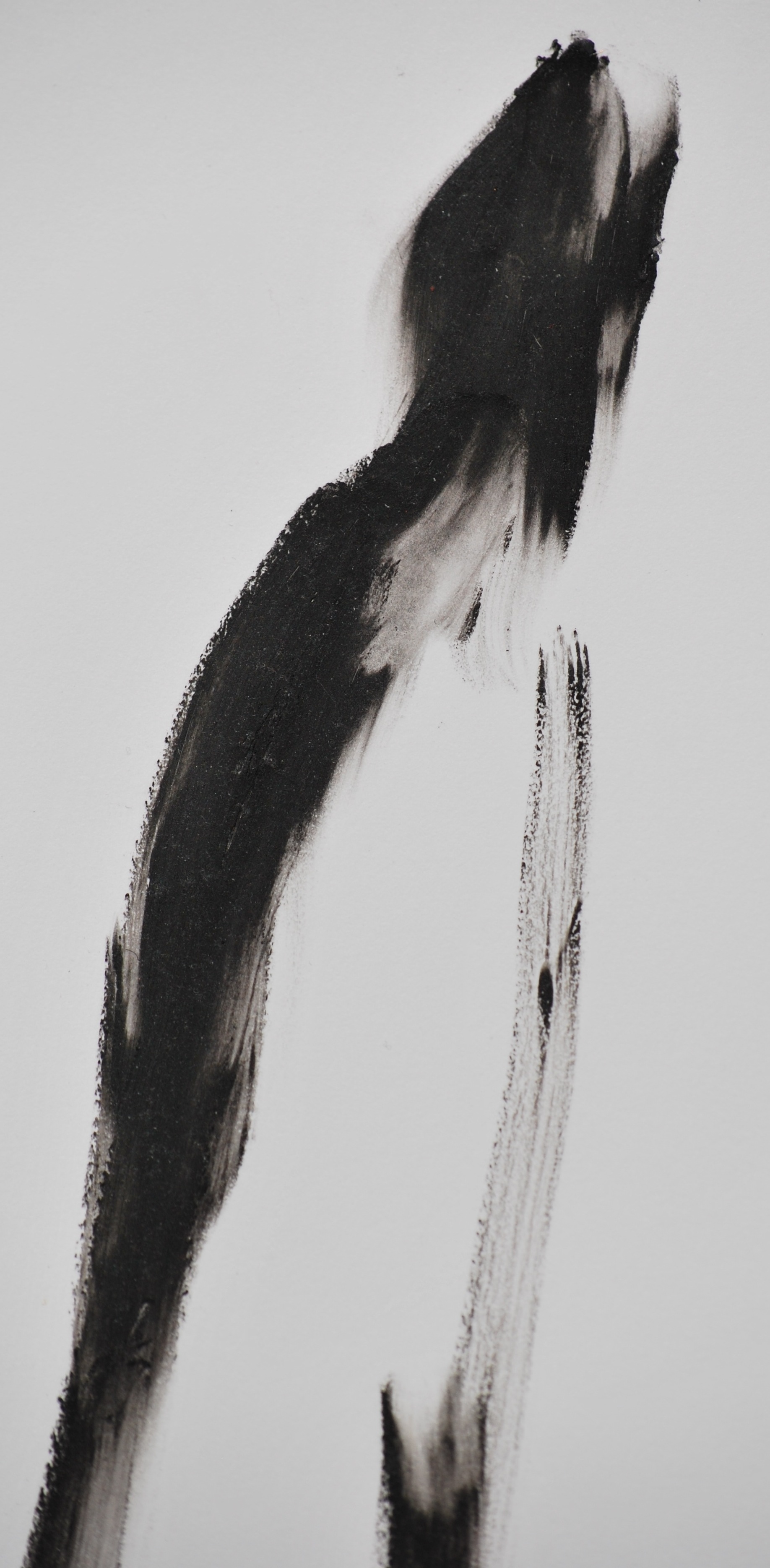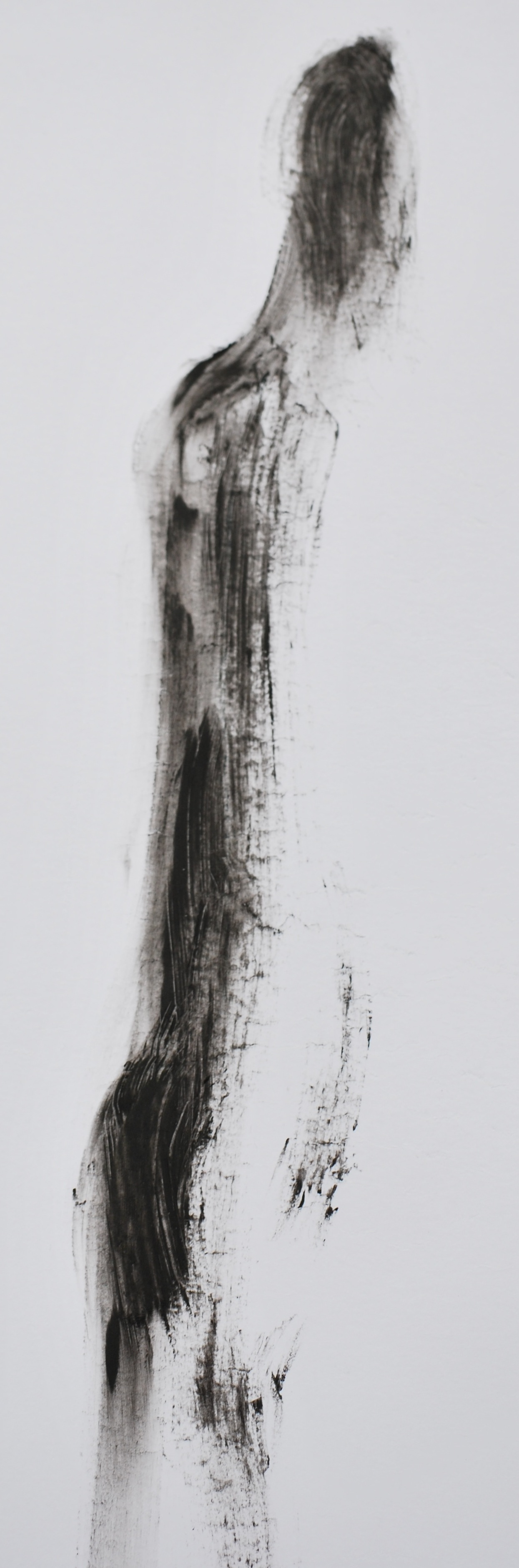 Dans Mesure au vide vous écrivez « ce n’est pas le même outil / que tu tiens / c’est ton encre / qui coule au monde », tandis que le premier vers de Trouée est « ici coule au noir ». Vos dessins, que vous appelez des « traces », laissent souvent apparaître le geste même de votre main traçant de haut en bas sur la feuille des silhouettes de créatures qui se tiennent debout. S’agissait-il pour vous de reproduire ce mouvement intérieur de coulée, de chute, comme s’il fallait représenter à la fois, et paradoxalement, l’effondrement de l’être (sa chute) mais toujours debout ?