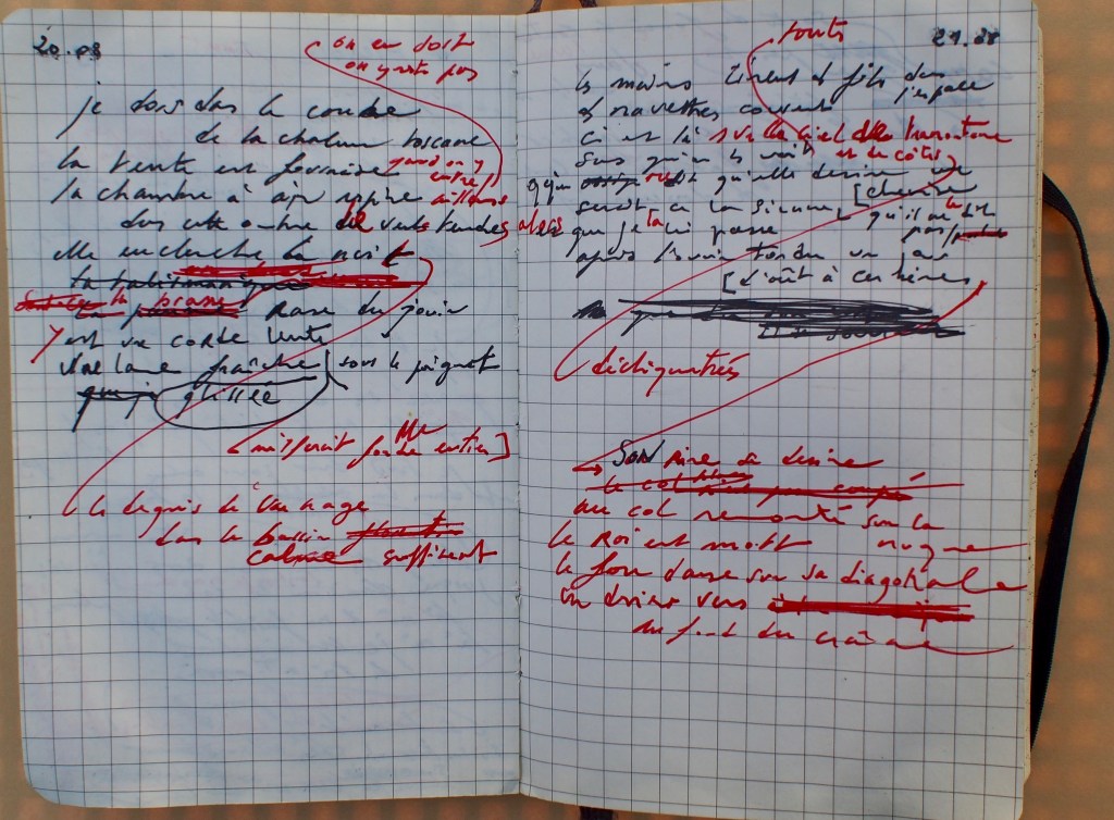 D’autre part, et pour répondre à la seconde question qui est enchâssée dans la première, il est vrai que les actes de la parole (Jean-Louis Chrétien), lesquels sont ceux de la conjugaison (au sens dynamique) de verbes, sont souvent associés, dans mes livres, à l’action de voir, à celle du revoir, et à tout un ensemble de façon de noter comment la vue nous saisit, jusqu’à la pulsion scopique, que je sais centrale. C’est là que se conjuguent des régimes de spatialisations (resserrements, rapprochements, ralentis, vitesses diverses, distanciations, effets zoom, etc.), bref tout un ensemble de focalisations, d’effets Zeis (variations des optiques), qui sont à faire entrer dans la langue. Trouver les équivalents visuels dans le corps de la syntaxe d’une langue en recherche, serait la tâche. Aussi, je le précise, revoir, le revoir du titre du livre que vous citez, n’est pas à comprendre comme un retour ou une vérification, un nouveau constat (c’était donc ça, que ça), mais un voir à nouveau tel que jamais il ne se fit peut-être avant, pour le poème, le livre, et ceci est à prendre moins dans le sens du voyant, que de celui de son acte ordinaire d’étonnement, de saisie, conjugué au gérondif, qui est un verbe à cheval comme le dit Mandelstam. Ce revoir est aussi le voir qui s’invite à la table et rejaillit au moment où il est convoqué par l’écriture. Il recherche moins à être fidèle à ce qui a été vu, à sa dimension passée, qu’à nommer avec le plus de précision possible ce qui a été perçu ; mais non-formulé. L’écriture étant alors une nasse qui vient attraper et fait remonter à la surface une multiplicité de perceptions auxquels s’agrègent d’autres éléments qui n’ont parfois aucun rapport avec l’image première. Mais il faut dire que cette pêche n’est souvent chez moi qu’une première étape qui va nécessiter de nombreux remaniements et notamment des déplacements à l’intérieur d’un poème, d’une page, plutôt que des corrections à la marge.