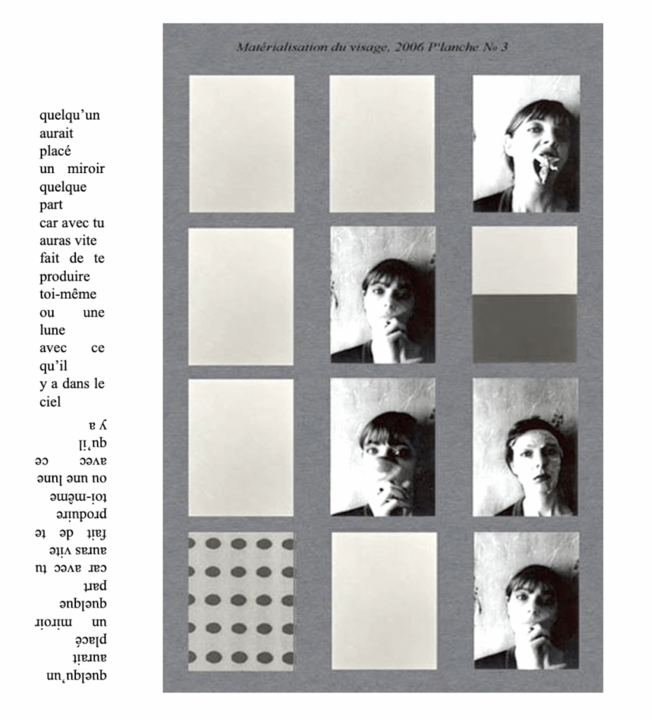 Ce qui m’est apparu sans doute plus que d’habitude encore c’est la rémanence, la répétition de certains motifs, des variations certes, des glissements et des pas de côté, mais des lignes obsessionnelles, rhizomatiques, sans début ni fin (pour le moment). Des lignes qui bifurquent à la poursuite d’une chose que je tente de déplier, replier, de traverser, d’infiltrer une fois que j’ai décidé de m’en saisir. À plusieurs reprises on m’a dit que mes livres étaient chacun comme le chapitre d’un seul en cours, pourquoi pas. Je répète volontiers, car j’aime ça particulièrement et que c’est ainsi que cela m’apparait, qu’il s’agit d’une sorte d’enquête en cours qui ne renvoie qu’à elle-même, une enquête irrésolue bien sûr, par le texte et par l’image, qui pourrait donc durer indéfiniment, en suspens comme le sont toutes celles qui m’ont fascinée, Cosmos de Gombrowicz avec son théâtre saturé de signes, Blow up d’Antonioni où l’enquête inaboutie se fait à la fois dans le parc et dans l’image photographique.
