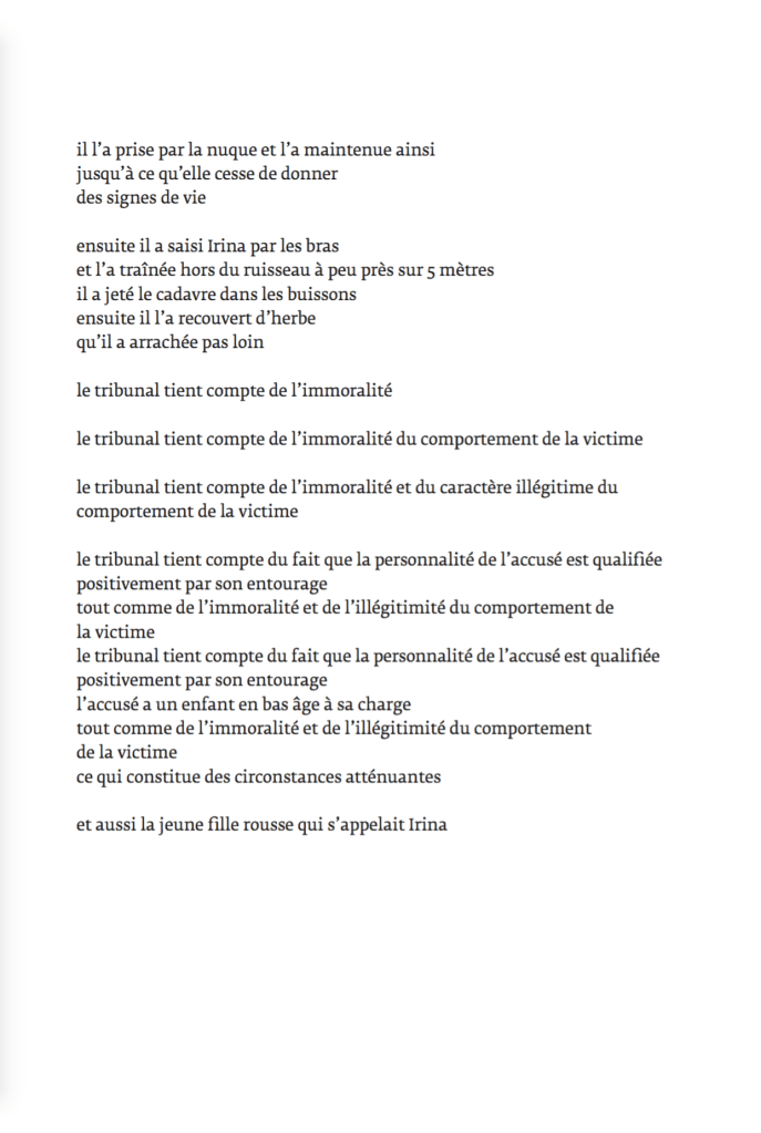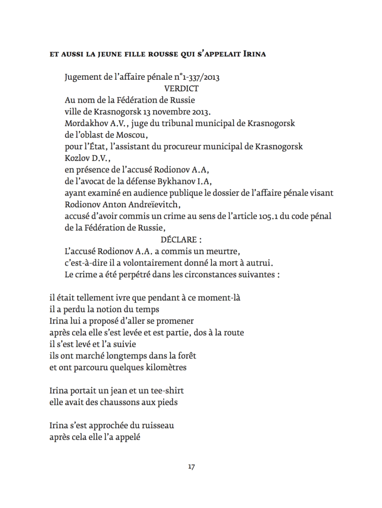 « Et aussi la jeune fille rousse qui s’appelait Irina », premier texte des Verdicts