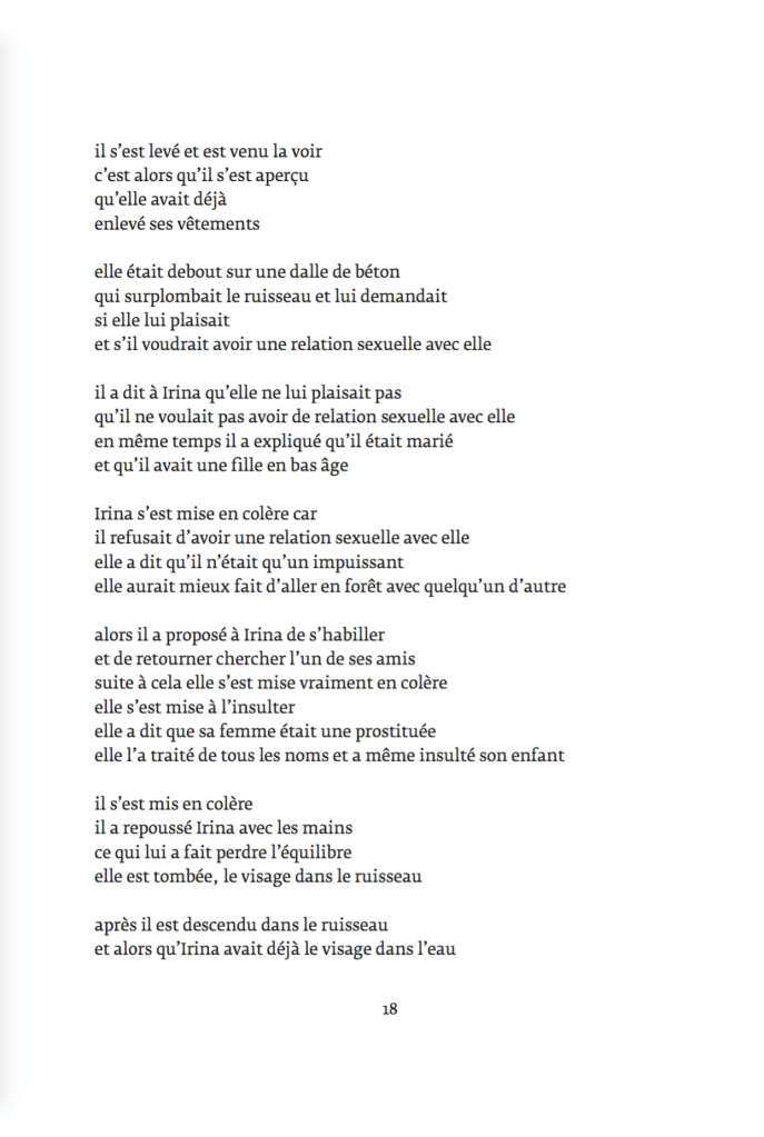 Pour reprendre la précieuse analyse donnée par Marina Skalova dans sa remarquable préface, les 14 poèmes procèdent d’un même geste de montage : la poétesse prélève des fragments dans des procès-verbaux, sans rien réécrire ni ajouter. L’écriture se fait uniquement par un saisissant travail de montage : Lida Youssoupova coupe, répète et sample. Ainsi que l’écrit la traductrice : « En s’attaquant à la langue du pouvoir, Lida Youssoupova fait témoigner les archives contre ceux qui les ont écrites. » (p. 8)
